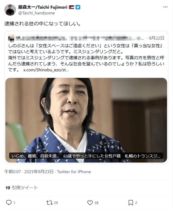 「 「女性スペースはご遠慮ください」という女性は『真っ当な女性』ではないと考えているようです。(...) 海外ではミスジェンダリングで逮捕される事例があります。(...) そんな社会を望んでいるのでしょうか?」 「逮捕される世の中になってほしい。」(2025年9月23日)