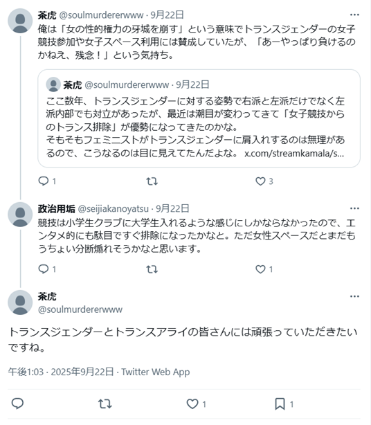 「 「女の性的権力の牙城を崩す」という意味でトランスジェンダーの女子競技参加や女子スペース利用には賛成していたが、「あーやっぱり負けるのかねえ、残念!」という気持ち。」 「女性スペースだとまだもうちょい分断煽れそうかなと思います。」 「頑張っていただきたいですね。」(2025年9月22日)