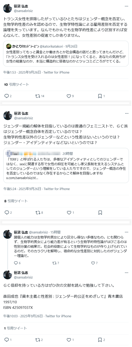 トランス女性を排除したがっているひとたちはジェンダー概念を否定し、生物学的性差のみを認めるので、生物学特性論による雇用差別を否定する論理を失っています。なんでもかんでも生物学的性差により区別すれば安心なんて、女性差別の促進でしかありません。(2025年9月26日)