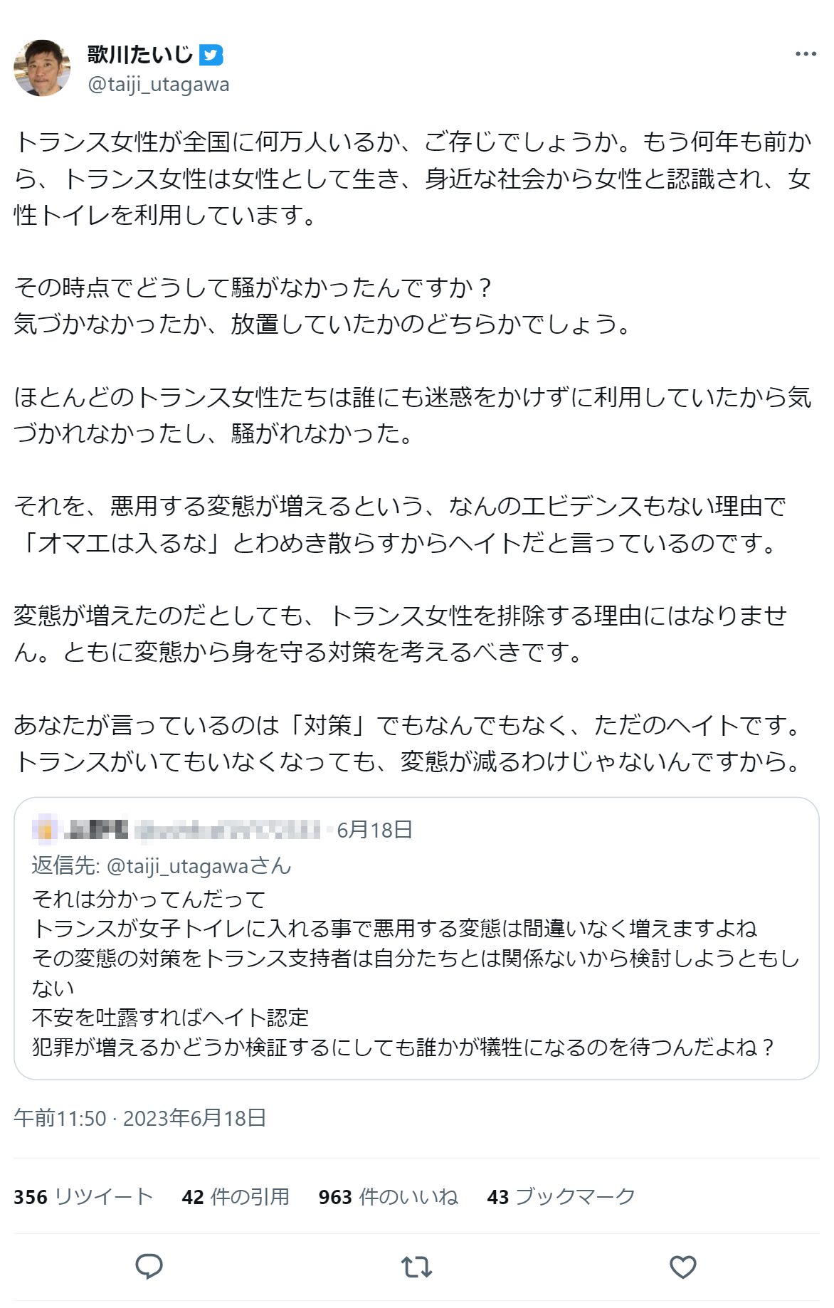 もう何年も前から、トランス女性は女性として生き、身近な社会から女性と認識され、女性トイレを利用しています。(...) 変態が増えたのだとしても、トランス女性を排除する理由にはなりません。(2023年6月18日)