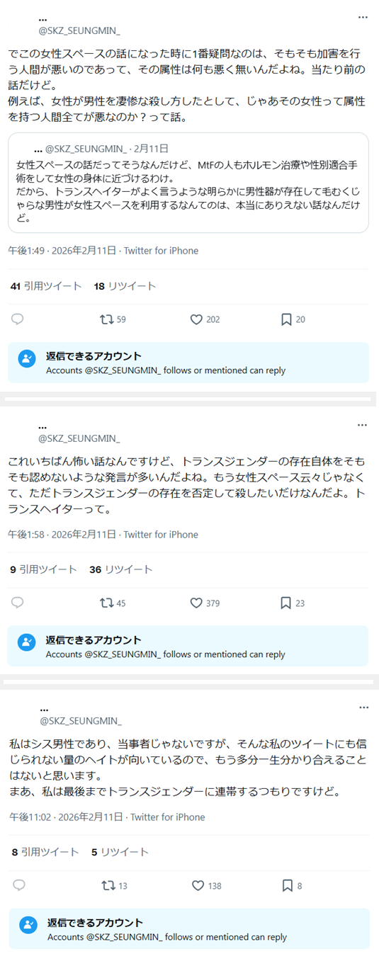 これいちばん怖い話なんですけど、トランスジェンダーの存在自体をそもそも認めないような発言が多いんだよね。もう女性スペース云々じゃなくて、ただトランスジェンダーの存在を否定して殺したいだけなんだよ。トランスヘイターって。(2026年2月11日)