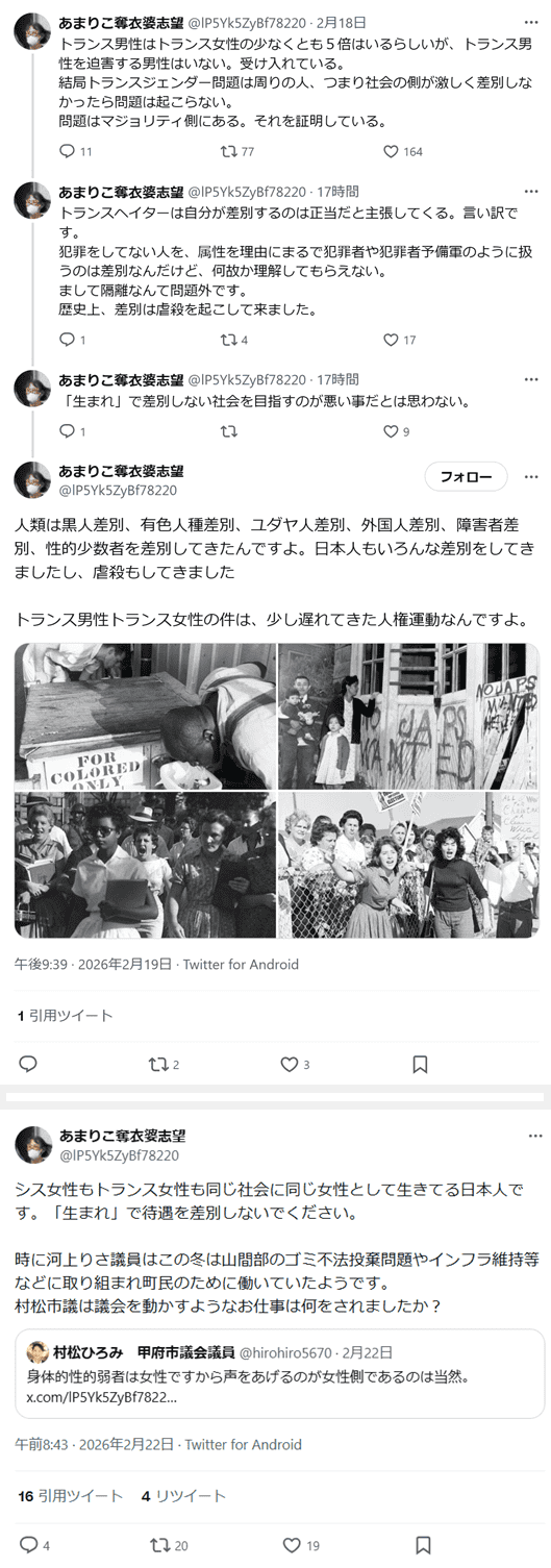 「小5男児(性自認女性)が女子トイレ、女子更衣室利用!」「いままで一緒に使っていたはずなのに、ある秘密を知ったから嫌だと。不安?。 例えば、ある病気を持っている、障害を持っている、感染はしない事は自明。(...) 何十年か前の◯イズ、ハ◯セン病、水俣◯と同じ。 愚かだね。」(2026年2月20日)