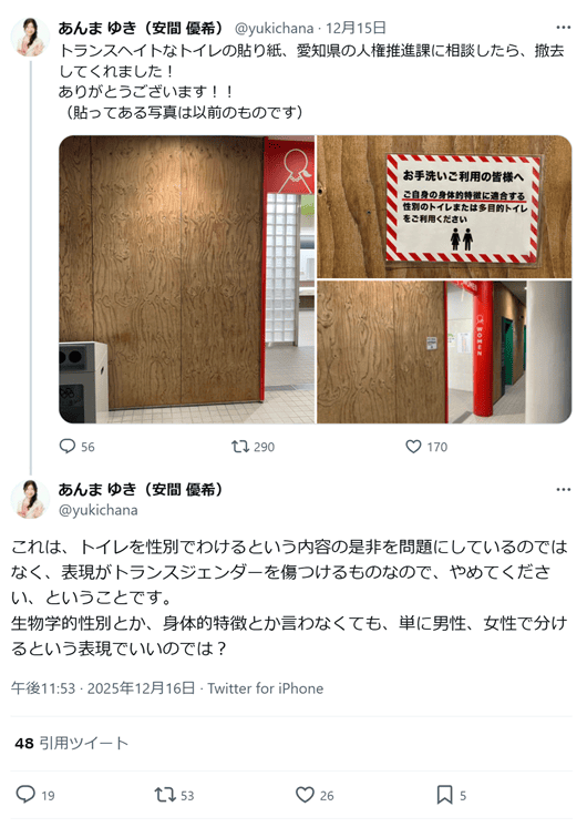 「ご自身の身体的特徴に適合する性別のトイレまたは多目的トイレをご利用ください」「トランスヘイトなトイレの貼り紙、愛知県の人権推進課に相談したら、撤去してくれました! ありがとうございます!!」(2025年12月15日)