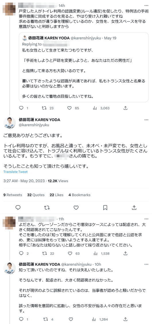 「トイレ利用なのですが、お風呂と違って、未オペ・未戸変でも、女性として社会に溶け込んで、トラブルなく利用しているトランス女性がたくさんいるんです」「誤解されているのは、当事者が認めろと騒いだからではなく、誤った情報を意図的に拡散し、女性の不安が煽る人々の存在だと思います」(2023年5月20日)
