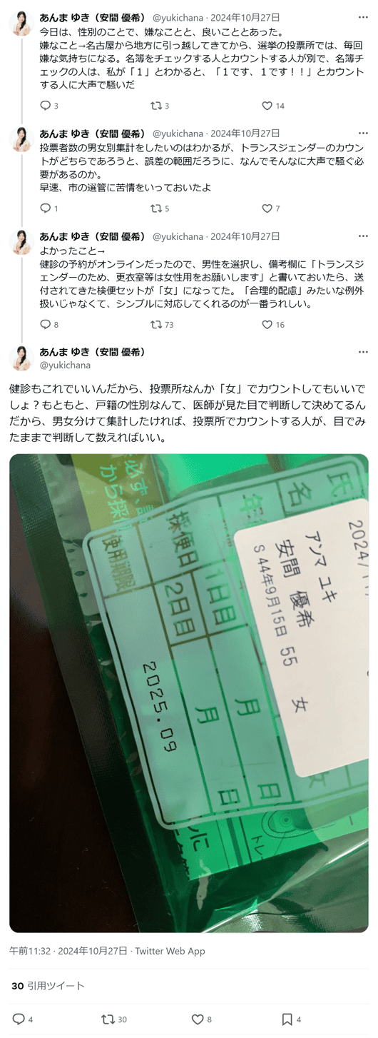 健診の予約がオンラインだったので、男性を選択し、備考欄に「トランスジェンダーのため、更衣室等は女性用をお願いします」と書いておいたら、送付されてきた検便セットが「女」になってた。(...) 健診もこれでいいんだから、投票所なんか「女」でカウントしてもいいでしょ?(2024年10月27日)