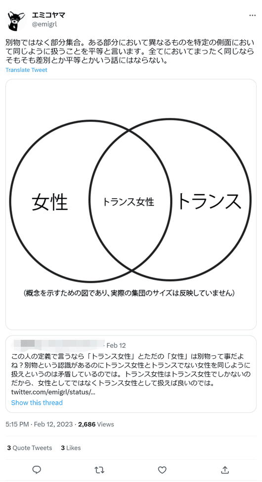 「別物という認識があるのにトランス女性とトランスでない女性を同じように扱えというのは矛盾している」「別物ではなく部分集合。ある部分において異なるものを特定の側面において同じように扱うことを平等と言います。全てにおいてまったく同じならそもそも差別とか平等とかいう話にはならない。」(2023年2月12日)