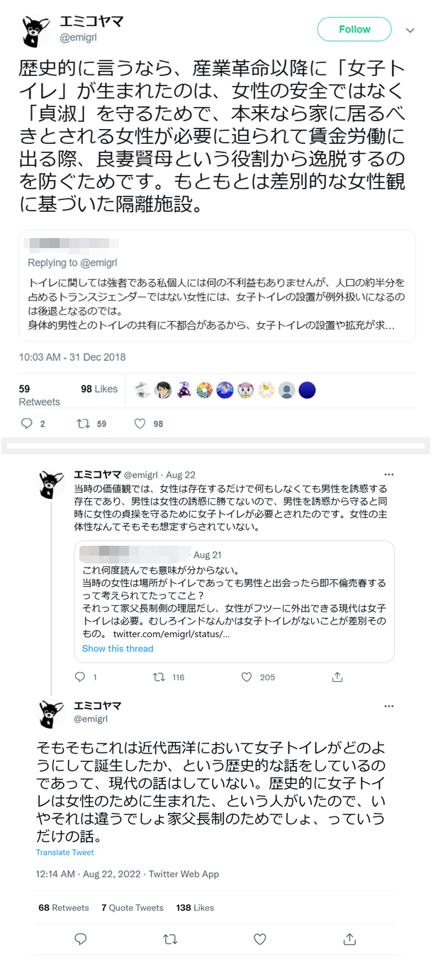 歴史的に言うなら、産業革命以降に「女子トイレ」が生まれたのは、女性の安全ではなく「貞淑」を守るためで、本来なら家に居るべきとされる女性が必要に迫られて賃金労働に出る際、良妻賢母という役割から逸脱するのを防ぐためです。もともとは差別的な女性観に基づいた隔離施設。(2018年12月31日)