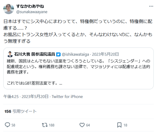 日本はすでにシス中心にまわってて、特権側だっていうのに、特権側に配慮する……? お風呂にトランス女性が入ってくるとか、そんなわけないのに、なんかもう無理すぎる(2023年5月20日)