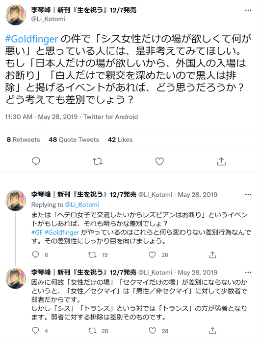 #Goldfinger の件で「シス女性だけの場が欲しくて何が悪い」と思っている人には、是非考えてみてほしい。(...) その差別性にしっかり目を向けましょう。(...) 「シス」「トランス」という対では「トランス」の方が弱者となります。弱者に対する排除は差別そのものです。(2019年5月28日)