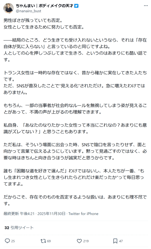 男性ぽさが残っていても否定。 女性として生きるために努力しても否定。 ――結局のところ、どう生きても受け入れないというなら、それは「存在自体が気に入らない」と言っているのと同じですよね。人としての心を押しつぶしてまで生きろ、というのはあまりにも酷い話です。(2025年11月30日)