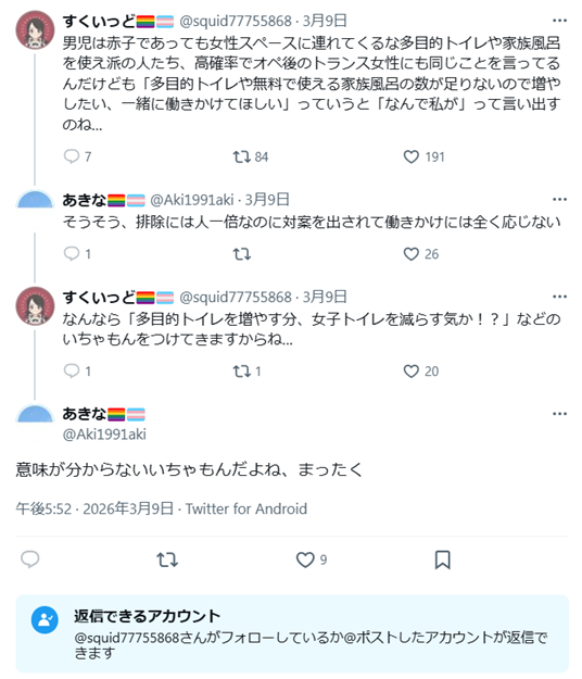 男児は赤子であっても女性スペースに連れてくるな多目的トイレや家族風呂を使え派の人たち、高確率でオペ後のトランス女性にも同じことを言ってるんだけども「多目的トイレや無料で使える家族風呂の数が足りないので増やしたい、一緒に働きかけてほしい」っていうと「なんで私が」って言い出すのね…(2026年3月9日)