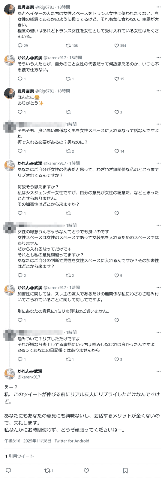 あとヘイターの人たちは女性スペースをトランス女性に使われたくない。を女性の総意であるかのように扱ってるけど。それも気に食わない。主語が大きい。 程度の違いはあれどトランス女性を女性として受け入れている女性はたくさんいる。(2025年11月8日)