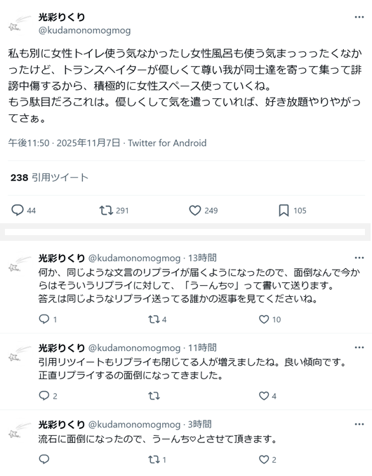 私も別に女性トイレ使う気なかったし女性風呂も使う気まっっったくなかったけど、トランスヘイターが優しくて尊い我が同士達を寄って集って誹謗中傷するから、積極的に女性スペース使っていくね。 もう駄目だろこれは。優しくして気を遣っていれば、好き放題やりやがってさぁ。(2025年11月7日)