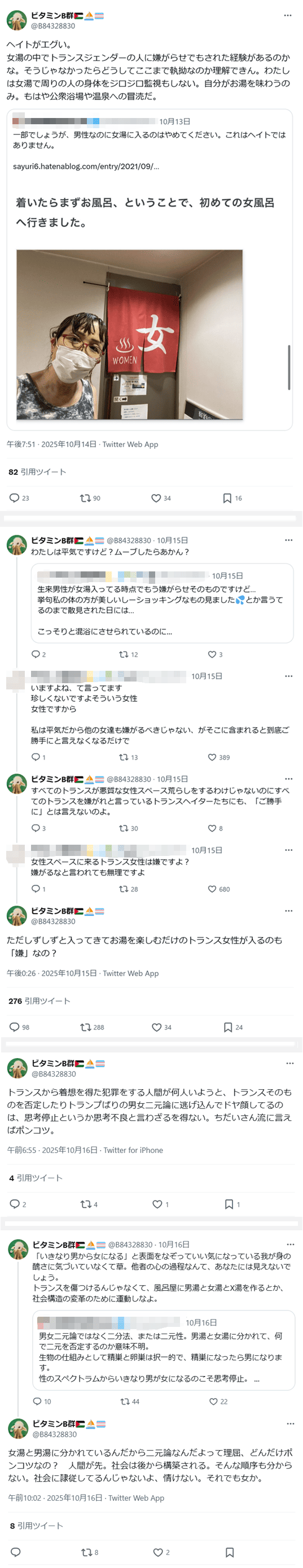 「男性なのに女湯に入るのはやめてください」「ヘイトがエグい。」「わたしは平気ですけど?ムーブしたらあかん?」「ただしずしずと入ってきてお湯を楽しむだけのトランス女性が入るのも「嫌」なの?」「風呂屋に男湯と女湯とX湯を作るとか、社会構造の変革のために運動しなよ」(2025年10月14日)