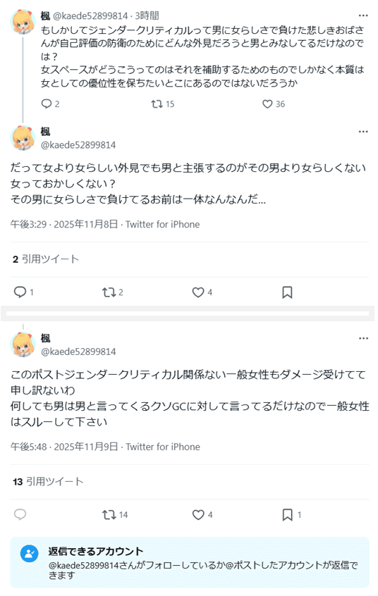[同一人物による投稿]この方コメント欄でトランスジェンダーのように言われていますが通常の男性でも女性的な名前の方いますし、少なくとも性別男なわけですし性転換もしていない通常の男性なのでは?小児性愛者の。 トランスジェンダーではないと思いますね。(2025年10月23日) https://womaniswoman.whoa.jp/db/w_trans/dbv/pict/1917/、私って怖い?脅威?怖くて外出られない?(2025年11月5日 ) https://megalodon.jp/2025-1106-0857-12/https://x.com:443/yuizuminh/status/1986025812433539276 - 引用 https://x.com/search?q=url%3A1986025812433539276&src=typed_query