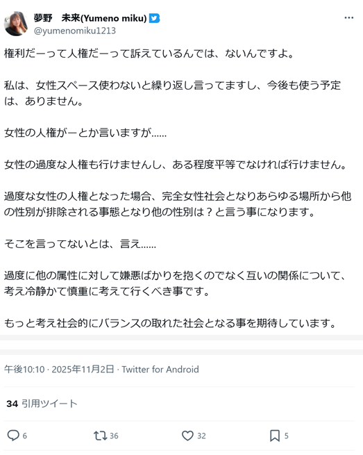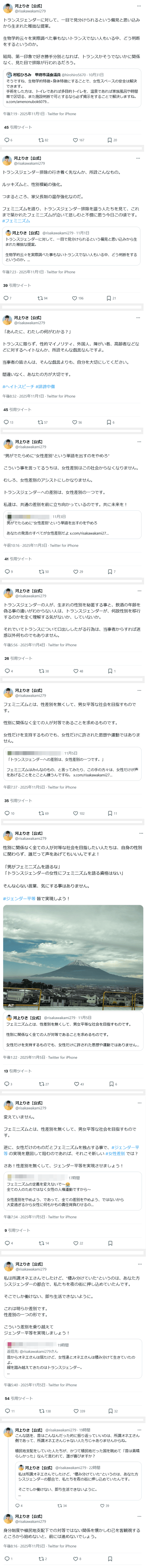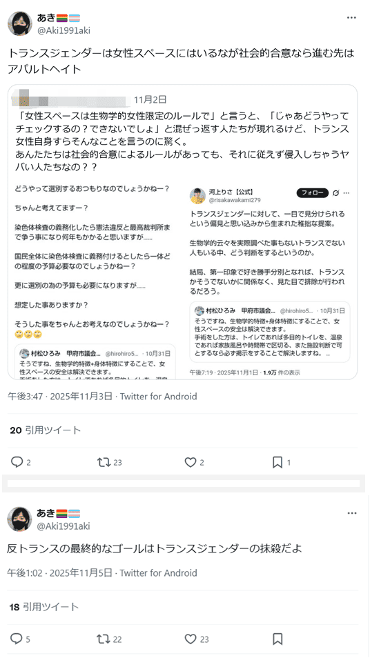「生物学的云々を実際調べた事もないトランスでない人もいる中、どう判断をするというのか。」「フェミニズムを語り、トランスジェンダー排除を謳う人たちを見て、これまで築かれたフェミニズムが泣いて悲しむと不憫に思う今日この頃です。」「トランスジェンダーへの差別は、女性差別の一つです。」(2025年11月1日)