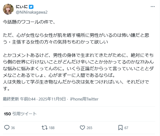 [関連]男性の身体で生まれてきたがために、絶対にそちら側の世界に行けないことがどんだけ辛いことか分かってるのかな⁇みんな悩みに悩みまくってんのに。いくら正論だからって言っていいこととダメなことあるでしょ、心がまず一に人間であるならば。人は失敗して学ぶ生き物なんだから次は気をつければいい (2025年11月9日) https://womaniswoman.whoa.jp/db/w_trans/dbv/pict/1929/