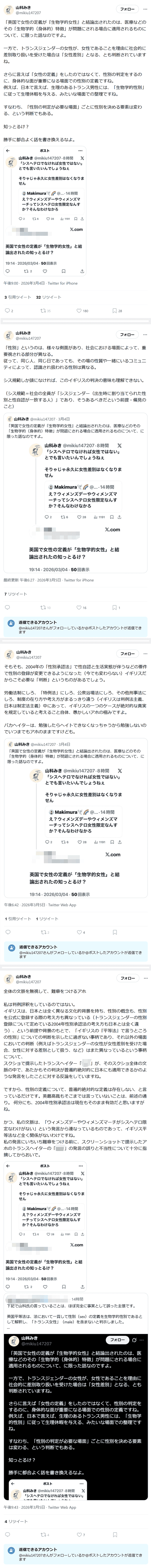「英国で女性の定義が『生物学的女性』と結論出されたのは、医療など (...) に限った話 (...) 知っとるけ?」「ほぼ完全に事実として誤った主張です。」「全体の文脈を無視して、難癖をつけるアホ 私は判例評釈をしているのではない。」(2026年3月4日)