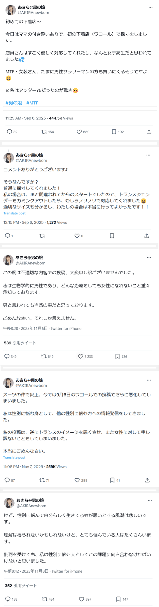 「初めての下着店〜 (...) 初の下着店(ワコール)で採寸をしました。店員さんはすごく優しく対応してくれたし、なんと女子高生だと思われてました💦 (...) #男の娘 #MTF」「性別に悩んで自分らしく生きてる者が悪いとする風潮は悲しいです。」(2025年9月6日)