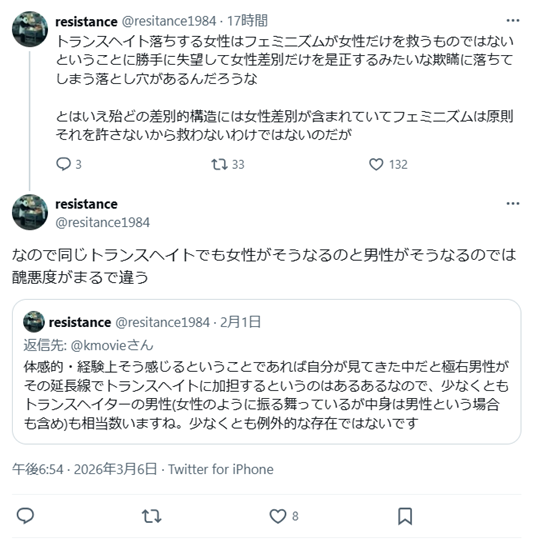 「本来主役であるはずの女性たちが「女性差別反対」を言わなくなってしまった。これは乗っ取りだ。」 「トランスヘイターたちが、ウィメンズマーチのコールに「女性の透明化だ」といちゃもんつけている女性差別に無知なツイートをいくつも見ました」(2026年3月10日)