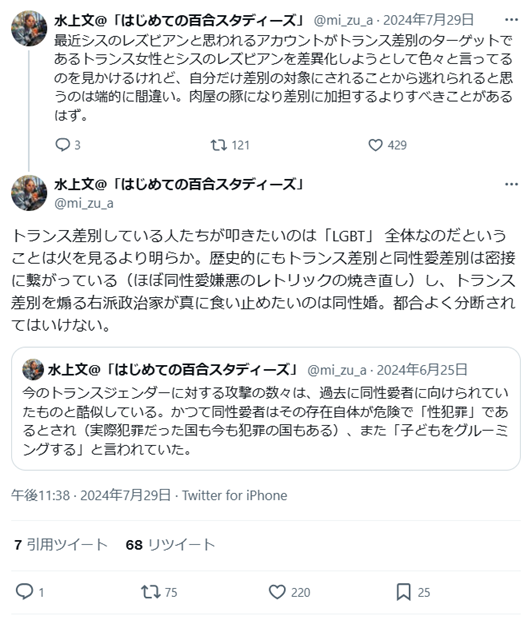 [参考:水上文] 水上文 @mi_zu_a[午前8:14 · 2021年11月24日]Twitter http://archive.today/2026.03.02-081323/https://x.com/mi_zu_a/status/1463288176911347721 ◇ 水上文「たったひとり、私だけの部屋で 2021年10月~11月 書くことの/と暴力」『文藝2022年春季号』https://www.kawade.co.jp/np/isbn/9784309980393/ 河出書房新社 (2022/1/7)、giganticspring「文藝 2022春号に掲載された水上文氏の文藝季評を読み、笙野頼子氏の言っていることを理解しようとして欲しいと思ったなど」HANA NO MEMO (2022-03-11) https://hananomemo.hatenablog.com/entry/2022/03/11/170843、栗原裕一郎 @y_kurihara[午前2:47 · 2024年5月14日]X https://twitter.com/y_kurihara/status/1790076361987526908 ◇ 「栗原裕一郎による文芸界の若手への執拗なハラスメント #栗原裕一郎氏による業界パワハラに抗議します #トランス差別に反対します」Togetter (2022年9月21日) https://togetter.com/li/1947673 ◇ 水上文「シスジェンダーとは何か」「私たちの問題――「トランスジェンダー問題」を捉え直す」「奪い返し、問い返す――「性同一性」をめぐって」『われらはすでに共にある : 反トランス差別ブックレット』https://www.hanmoto.com/bd/isbn/9784768459478 現代書館 (2023/8/23、初出 2022/11) ◇ 水上文 @mi_zu_a[午後3:29 · 2022年11月17日]Twitter http://archive.today/2026.03.02-075309/https://x.com/mi_zu_a/status/1593129180618977281 ⇒「たとえば「子どもへの安易なホルモン投与や性器切除」ともあるけど、ブロッカーの効果はほぼ可逆的で知られてること、小児科医アカデミーが子どもの自殺を防ぐ最良の方法として医療を推奨してること等を意図的に無視している。」 * 笙野頼子「今年も押し詰まってまいりました」Female Liberation Jp (2022年12月27日) https://femalelibjp.net/?p=1001 ◇ 水上文「不正義に抗う言論は――未来のために、より良い言論空間を開く 田中秀臣・栗原裕一郎による対談記事(本紙3502号)への異論」『週刊読書人 2023年9月8日号』読書人 (2023年9月8日) http://archive.today/2026.03.02-092709/https://x.com/Dokushojin_Club/status/1698999414508163271 - 引用 https://x.com/search?q=url%3A1698999414508163271&src=typed_query ・ http://archive.today/2026.03.02-084928/https://x.com/mi_zu_a/status/1699011725088231451 * 「[note]田中秀臣×栗原裕一郎トークイベント載録・完全版 <不寛容な時代に抗う言論は>」『週刊読書人 2023年8月18日号』読書人 (2023年8月18日) http://web.archive.org/web/20240118032036/https://jinnet.dokushojin.com/products/note-20230818 http://archive.today/2026.03.02-085917/https://x.com/Dokushojin_Club/status/1691389268986359808 - 引用 https://x.com/search?q=url%3A1691389268986359808&src=typed_query ◇ 「インターセクショナル・フェミニズム 共に闘い、共に変えるために 水上文」好書好日 (2024.03.13) https://book.asahi.com/article/15194494、「(水上文の文化をクィアする)追いやられるマイノリティー、社会への問い」朝日新聞デジタル (2024年4月6日) https://www.asahi.com/articles/DA3S15906539.html ◇ 水上 文、清水晶子「「フェミニズムの敗北」を乗り越えるために」『地平 8月号』https://chiheisha.co.jp/2024/06/27/chihei8/ 地平社 (2024年7月5日)、 千田有紀「清水晶子さんに問う「フェミニズムの敗北」とは?(『地平』2号水上文三との対談より)」note (2024年7月5日) https://note.com/sendayuki/n/n4c2c1fd06e4f ◇ Seesaw Books「クィア的闘争と時代の記録:李琴峰『言霊の幸う国で』刊行記念トークイベント ――さっぽろレインボープライド開催によせて―― 対談 李琴峰×水上文」 Peatix (2024年9月13日) https://peatix.com/event/4089612 ◇ 水上文 @mi_zu_a [午後1:39 · 2025年11月6日]X http://archive.today/2026.03.02-091418/https://x.com/mi_zu_a/status/1986292271999033573 http://archive.today/2026.03.02-094443/https://x.com/mi_zu_a/status/1986293761471881564 ⇒ミシガン女性音楽祭とキャンプトランス [参考]Dana Rivers https://www.womenarehuman.com/male-transgender-famed-trans-right-activist-accused-of-violent-murder-of-female-couple-their-son-dana-rivers/ https://reduxx.info/trans-activist-to-stand-trial-for-the-brutal-murder-of-a-lesbian-couple-and-son/ https://reduxx.info/breaking-prominent-trans-activist-sentenced-to-life-in-prison-for-murder-of-california-family/ ◇ 水上文「『ハリー・ポッター』はマイノリティの「味方」なのか? 物語が描いた差別と取りこぼしたもの」CINRA (2025.12.05) https://www.cinra.net/article/202512-harrypotterjkr_ienkmkt、近藤銀河、水上文、中村香住『はじめての百合スタディーズ クィア/フェミニストの視点から』太田出版 (2026/2/27) https://www.hanmoto.com/bd/isbn/9784778341152