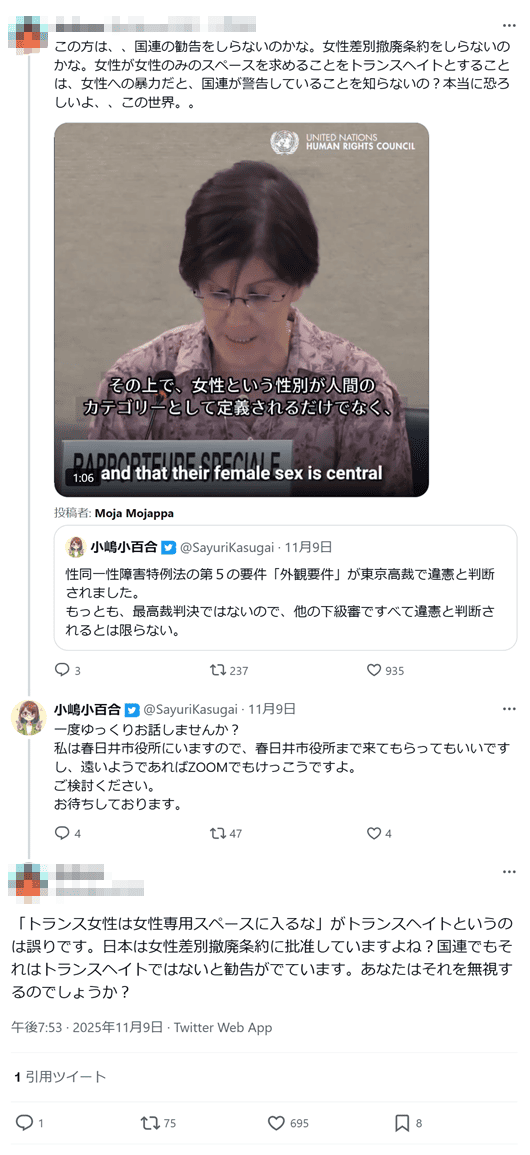 「女性が女性のみのスペースを求めることをトランスヘイトとすることは、女性への暴力だと、国連が警告していることを知らないの?」「一度ゆっくりお話しませんか?(...) 遠いようであればZOOMでもけっこうですよ。 ご検討ください。 お待ちしております。」(2025年11月9日)