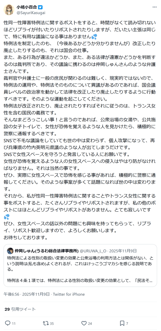 「性同一性障害特例法に関するポストをすると、時間がなくて読み切れないほどリプライが付いたりリポストされたりしますが、だいたい主張は同じで、特に有用な議論になる事はありません💦」「SNSで不毛な議論をしていても世の中は変わらず、個人攻撃になって、××のような人が出てしまうだけ」(2025年11月9日)