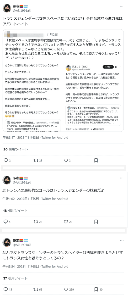 「生物学的云々を実際調べた事もないトランスでない人もいる中、どう判断をするというのか。」「フェミニズムを語り、トランスジェンダー排除を謳う人たちを見て、これまで築かれたフェミニズムが泣いて悲しむと不憫に思う今日この頃です。」「トランスジェンダーへの差別は、女性差別の一つです。」(2025年11月1日)