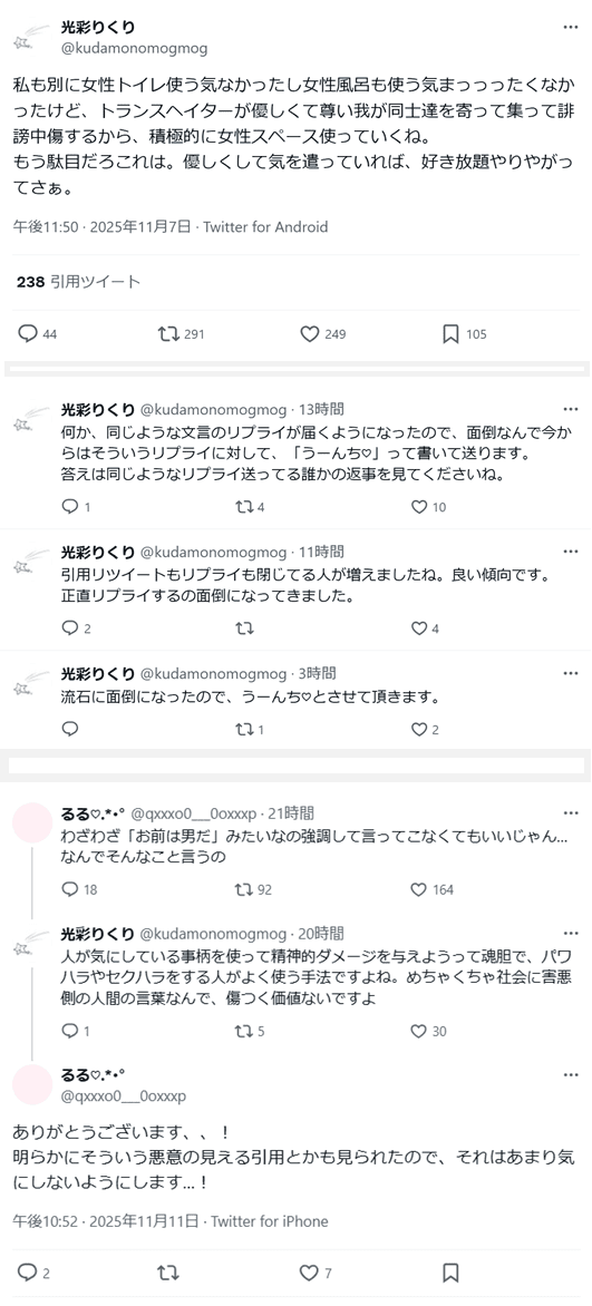 私も別に女性トイレ使う気なかったし女性風呂も使う気まっっったくなかったけど、トランスヘイターが優しくて尊い我が同士達を寄って集って誹謗中傷するから、積極的に女性スペース使っていくね。 もう駄目だろこれは。優しくして気を遣っていれば、好き放題やりやがってさぁ。(2025年11月7日)