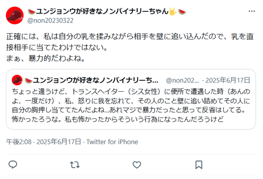 トランスヘイター(シス女性)に便所で遭遇した時(あんのよ、一度だけ)、私、怒りに我を忘れて、その人のこと壁に追い詰めてその人に自分の胸押し当ててたんだよね…あれマジで暴力だったと思って反省はしてる。怖かったろうな。私も怖かったからそういう行為になったんだろうけど(2025年6月17日)