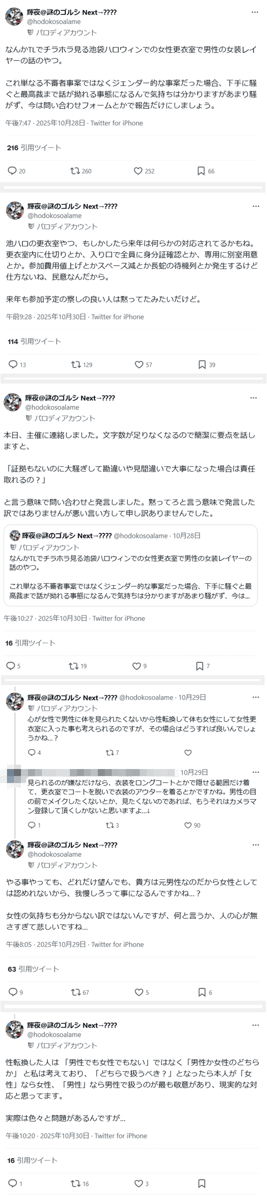 なんかTLでチラホラ見る池袋ハロウィンでの女性更衣室で男性の女装レイヤーの話のやつ。 これ単なる不審者事案ではなくジェンダー的な事案だった場合、下手に騒ぐと最高裁まで話が拗れる事態になるんで気持ちは分かりますがあまり騒がず、今は問い合わせフォームとかで報告だけにしましょう。(2025年10月28日)