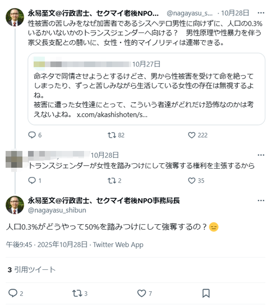 「性被害の苦しみをなぜ加害者であるシスヘテロ男性に向けずに、人口の0.3%いるかいないかのトランスジェンダーへ向ける? 男性原理や性暴力を伴う家父長支配との闘いに、女性・性的マイノリティは連帯できる。」 「人口0.3%がどうやって50%を踏みつけにして強奪するの?😑」(2025年10月28日)
