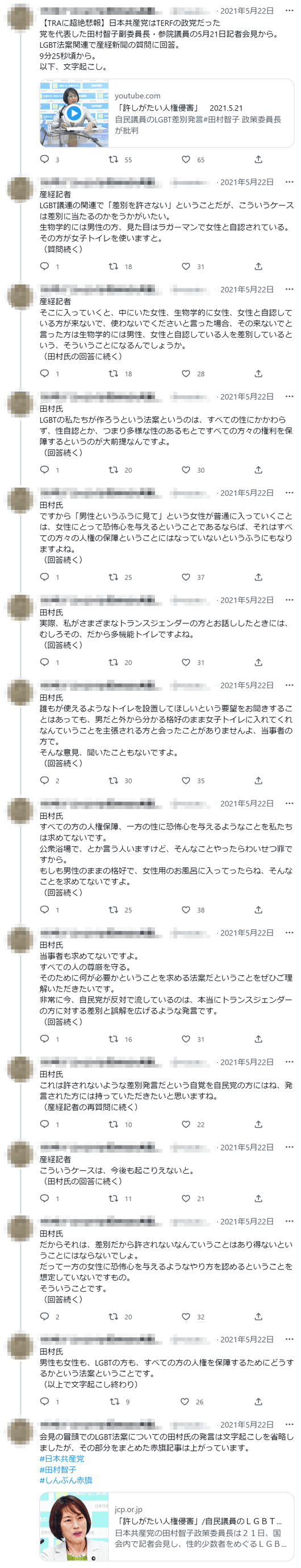 トランスジェンダーは、自称、自認すればトランスジェンダーとなるんではないんです。トランスを騙る男性とトランスジェンダーとは違いますし、しかもトランスジェンダーの中にもおそらくは存在するだろう変質者は、一般男性の中の変質者の確率と母数が違うのではるかに少ない。そうでしょう?(2021年5月16日)