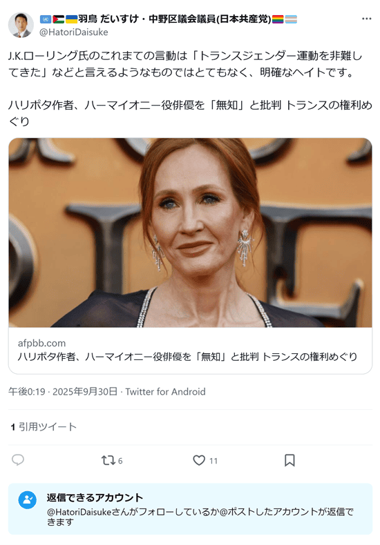 J.K.ローリング氏のこれまての言動は「トランスジェンダー運動を非難してきた」などと言えるようなものではとてもなく、明確なヘイトです。(2025年10月30日)