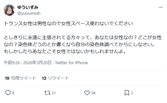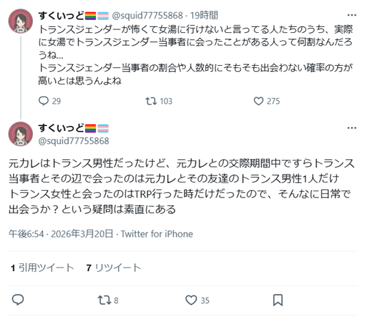http://archive.today/2026.03.23-004146/https://x.com/UcDd6yfkNz12179/status/2034935951714304029 - 引用 https://x.com/search?q=url%3A2034935951714304029&src=typed_query ◇ 「女湯で生物学的男性と出くわす確率は無視できるくらい少ない。私の周りにはそのような理由で温泉に行くのを控えている女性は1人もいませんが。」http://archive.today/2026.03.23-005657/https://x.com/UcDd6yfkNz12179/status/2034909205996740904 - 引用 https://x.com/search?q=url%3A2034909205996740904&src=typed_query