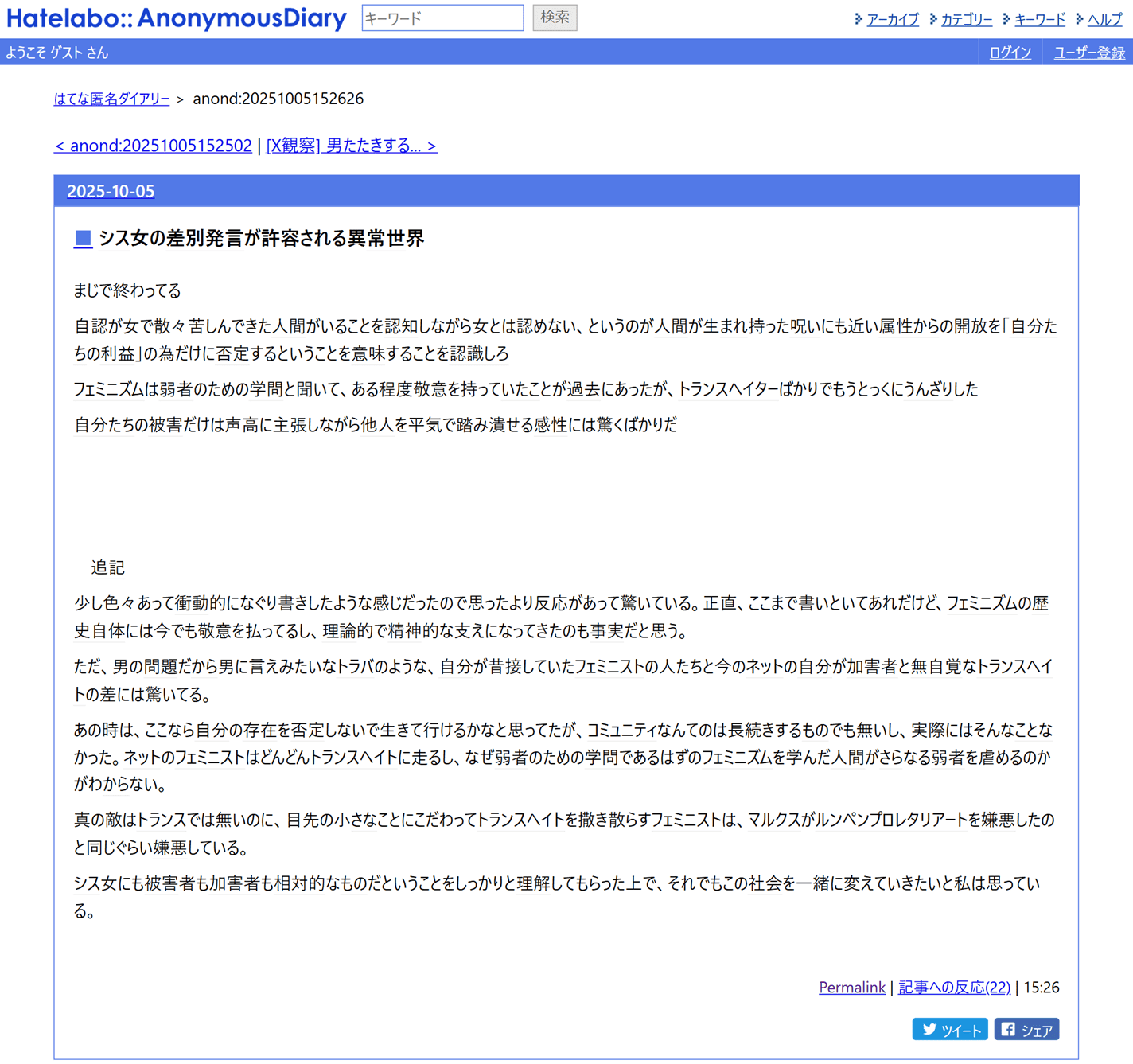 「シス女の差別発言が許容される異常世界」はてな匿名ダイアリー (2025-10-05) http://archive.today/2025.10.06-013003/https://anond.hatelabo.jp/20251005152626