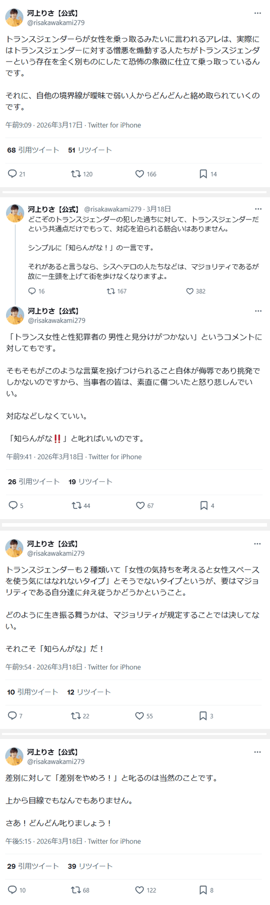 [関連]ウクレレ歌人さかなちゃん「共産党の自称トランス女性議員は女性の味方ではない事を自ら証明する。ー河上りさ氏のスレッドを分析」note (2026年3月19日) https://note.com/sakana20001/n/n8911d460ca33
