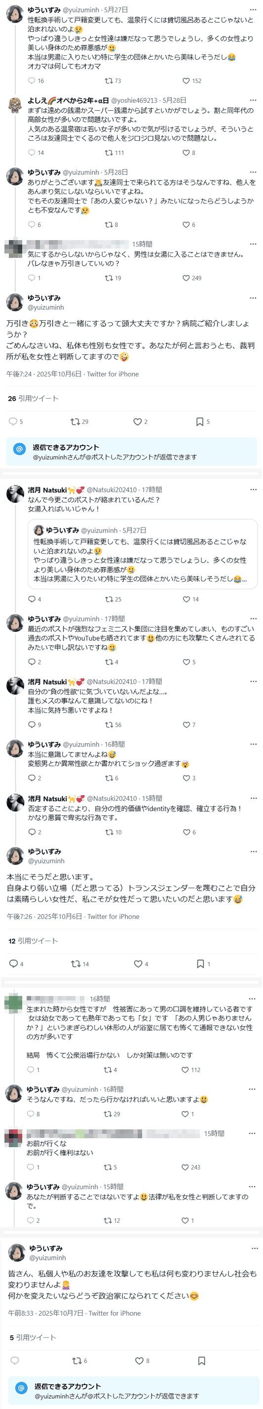「男性は女湯に入ることはできません」 「ごめんなさいね、私体も性別も女性です。あなたが何と言おうとも、裁判所が私を女性と判断してますので🤪」 「自身より弱い立場(だと思ってる)トランスジェンダーを蔑むことで自分は素晴らしい女性だ、私こそが女性だって思いたいのだと思います😅」(2025年5月27日)