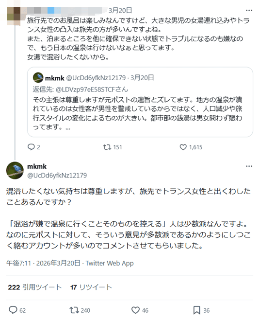 混浴したくない気持ちは尊重しますが、旅先でトランス女性と出くわしたことあるんですか? 「混浴が嫌で温泉に行くことそのものを控える」人は少数派なんですよ。なのに元ポストに対して、そういう意見が多数派であるかのようにしつこく絡むアカウントが多いのでコメントさせてもらいました。(2026年3月20日)