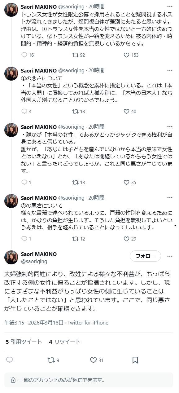 トランス女性が女性限定公募で採用されることを疑問視するポストが流れてきましたが、疑問視自体が差別にあたると思います。理由は、①トランス女性を本当の女性ではないと一方的に決めつけている、②トランス女性が戸籍を変えるために被る肉体的・時間的・精神的・経済的負担を無視しているからです。(2026年3月18日)