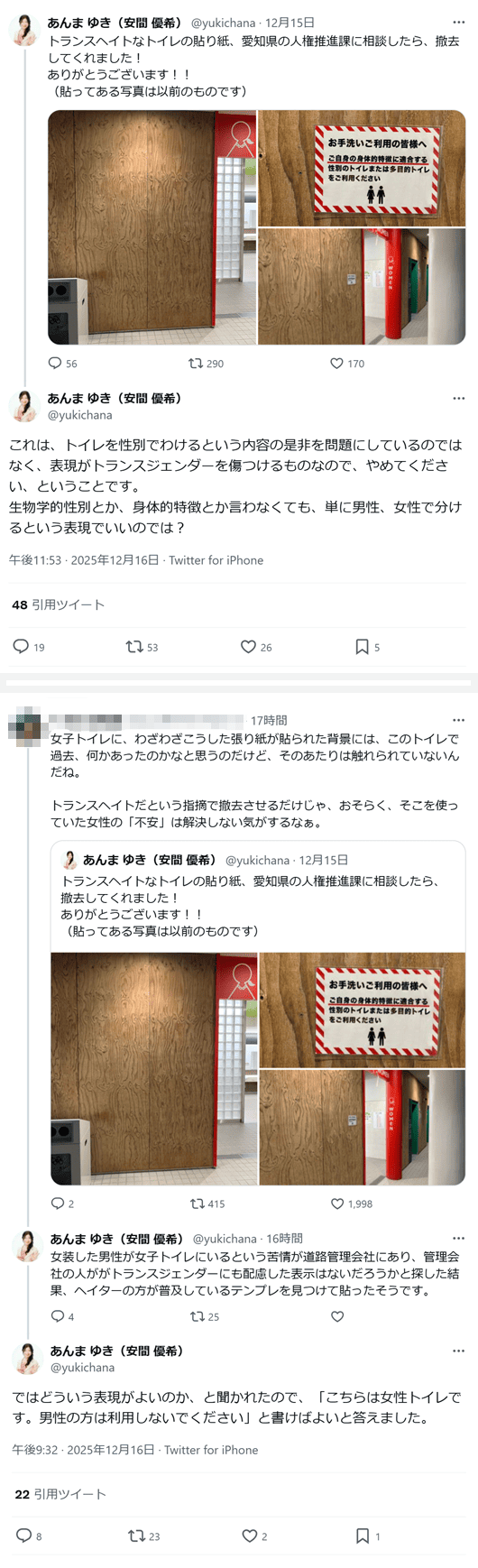 「ご自身の身体的特徴に適合する性別のトイレまたは多目的トイレをご利用ください」「トランスヘイトなトイレの貼り紙、愛知県の人権推進課に相談したら、撤去してくれました! ありがとうございます!!」(2025年12月15日)