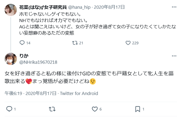 「くたばって欲しい法律を利用するというのは、どういう神経なんでしょうか?」 「私は現在も特例法やそれを中心としたGID規範や選民主義は批判の対象としていますよ。」 「それだけ批判されていながら、制度だけはしっかりと利用されるというわけですね。よくわかりました。」(2018年7月20日)