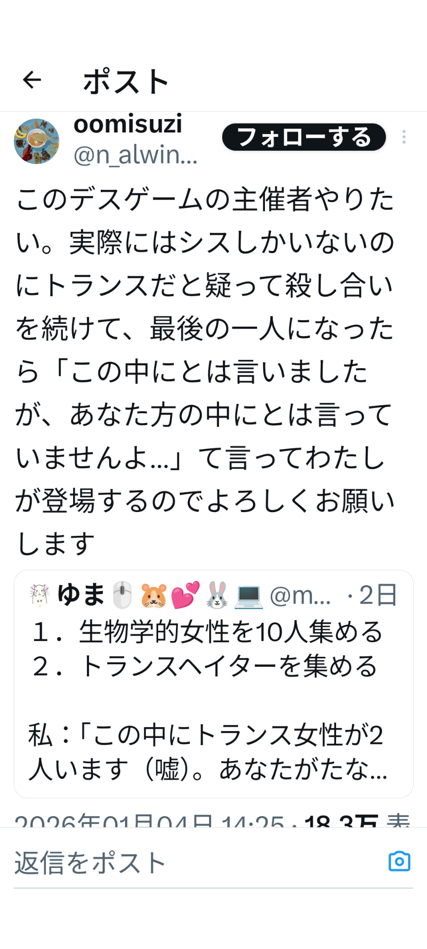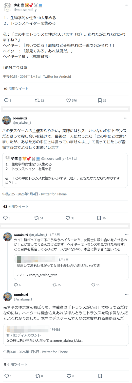 「生物学的女性を10人集める」「トランスヘイターを集める」「この中にトランス女性が2人います(嘘)。あなたがたならわかりますね?」「このデスゲームの主催者やりたい。実際にはシスしかいないのにトランスだと疑って殺し合いを続けて、最後の一人になったらわたしが登場する」(2026年1月3日)