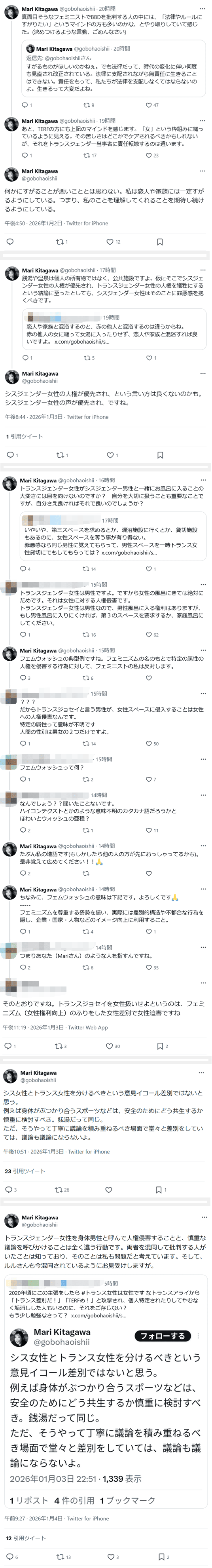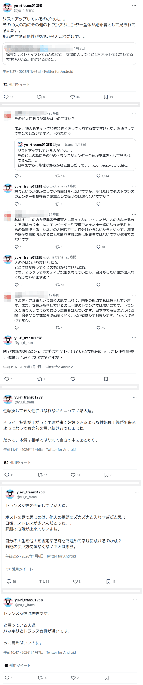 「19人の為にその他のトランスジェンダー全体が犯罪者として見られてるんだ。。 犯罪をする可能性があるからと言うだけで」「確かにしている事は良くないですが、それだけで他のトランスジェンダーも犯罪者予備軍として扱うのは違くないですか?」(2026年1月6日)