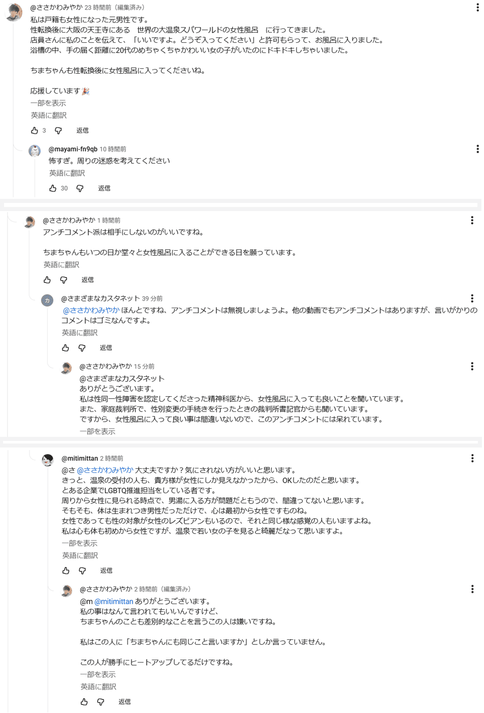 ※総じて「be kind」の呼びかけ。 ※「銭湯や温泉は個人の所有物ではなく、公共施設ですよ。」 ⇒引用元は、「恋人や家族と混浴するのと、赤の他人と混浴するのは違う」ので、公共施設で赤の他人、見知らぬ男性に裸を見られることを受忍させられるべきではないという主旨だが、投稿者はそれに「銭湯や温泉は個人の所有物ではなく、公共施設ですよ。」と応えている。要は「公共施設なので」我慢しろ、受忍しろと言いたいのだと思われる。通常の社会生活で、お互いに関係を築く労力を払った相手か、親しい親族としか共有しない状況を、見知らぬ異性と共有をされられるのは明らかに過大な負担であり、公共のルールとして不適切である。投稿者は男性の都合のために、女性に不当な自己犠牲を要求している。 ※「仮にそこでシスジェンダー女性の人権が優先され、トランスジェンダー女性の人権を犠牲にするという結論に至ったとしても、シスジェンダー女性はそのことに罪悪感を抱くべきです。」 ⇒現時点では男女に分離した施設運営を容認するならば、「トランス女性」≒トランス自認男性・女性自認男性・女装男性と比較されるべきなのは、「トランスジェンダーではない男性」であって、「シスジェンダー女性」ではない。「トランス女性」≒トランス自認男性・女性自認男性・女装男性は、トランスジェンダーであるがゆえに男女に分離した施設運営における男性用の同性のみの空間を安心して利用できる状態にないという認識は妥当であると思われ、当事者の置かれた状況に共感・同情し、制度による対応を求めることは、「社会で共に生きている」市民として、性別を問わず自然な態度である。しかし投稿者は「シスジェンダー女性はそのことに罪悪感を抱くべき」と、女性にのみ過剰な自責を要求している。「「トランス女性」≒トランス自認男性・女性自認男性・女装男性は、トランスジェンダーであるがゆえに男女に分離した施設運営における男性用の同性のみの空間を安心して利用できる状態にない」ことは、女性の責任ではなく、罪悪感を抱く理由はない。投稿者には、他の女性に自己犠牲による受忍を要求する資格はない。 ※「トランスジェンダー女性がシスジェンダー男性と一緒にお風呂に入ることの大変さには目を向けないのですか?」 ⇒引用元では第三スペース・混浴施設・貸切施設が提案されているが、投稿者は依然として女性に対してのみGuilt trip https://en.wikipedia.org/wiki/Guilt_trip による自己犠牲を要求し続けている。投稿者にとっては、女性が見知らぬ男性に裸を見られ、通常の社会生活ではありえない状況に置かれる心理的負荷や苦痛はどうでもいいらしい。 ※「シス女性とトランス女性を分けるべきという意見イコール差別ではないと思う。」「丁寧に議論を積み重ねるべき場面で堂々と差別をしていては、議論も議論にならない」「トランスジェンダー女性を身体男性と呼んで人権侵害することと、慎重な議論を呼びかけることは全く違う行動」 ⇒①特定の場面での男女に分離した施設運営を容認するのか ②「トランス女性」は女性なのか男性なのか ➂別の属性を犠牲にせずに当事者の自由・社会的機会・安全・プライバシーおよびバウンダリーをどのように保障するか、という三つの論点が考えられる。議論の過程で②、当事者の性別に言及せずに済ませることは不可能であり、議論の過程で当事者の性別に言及することは人権侵害ではない。投稿者は一貫して「女が黙って耐えれば丸く収まる」としか言っておらず、侍女としての恭順さが気の毒になる。