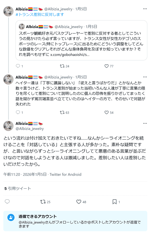 ヘイター達は「丁寧に議論しない」「従えと言うばかりだ」とかなんとか散々言うけど、トランス差別が始まった当初いろんな人達が丁寧に言葉の限りを尽くして差別について説明したのに個人の恐怖を振りかざしてまったく話を聞かず罵詈雑言並べ立てていたのはヘイターの方で、そのせいで対話が失われた(2026年1月5日)