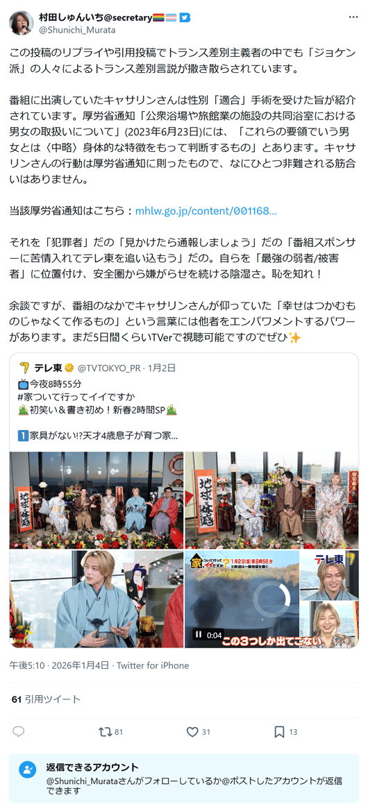 この投稿のリプライや引用投稿でトランス差別主義者の中でも「ジョケン派」の人々によるトランス差別言説が撒き散らされています。(...) キャサリンさんの行動は厚労省通知に則ったもので、なにひとつ非難される筋合いはありません。(2026年1月4日)